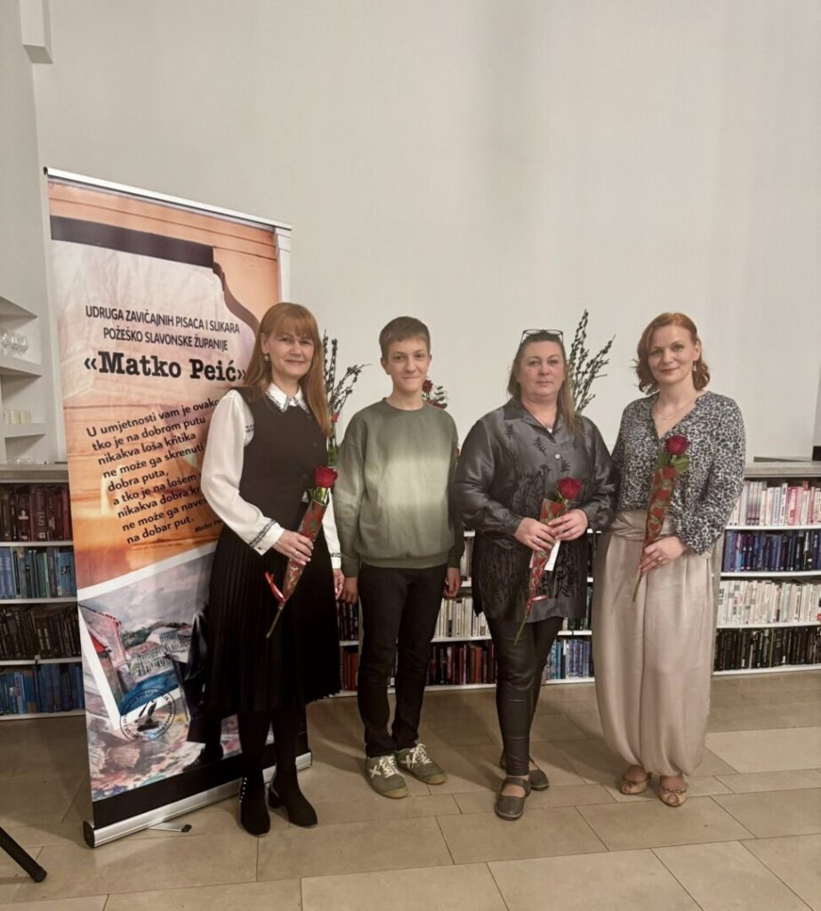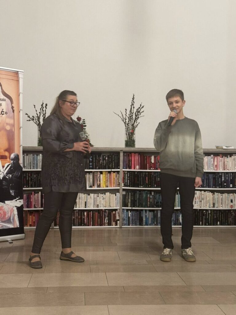 Večeras su u Gradskoj knjižnici Požega na svečanom proglašenju laureata natječaja za najbolju kratku pjesmu u duhu Matka Peića u organizaciji Udruge zavičajnih pisaca i slikara Požeško-slavonske županije “Matko Peić”, nastupili nas učenik Jakov Puljić i profesorica Danijela Petrinić duetom uglazbljene pjesme Dobriše Cesarića “ Balada iz predgrađa”.