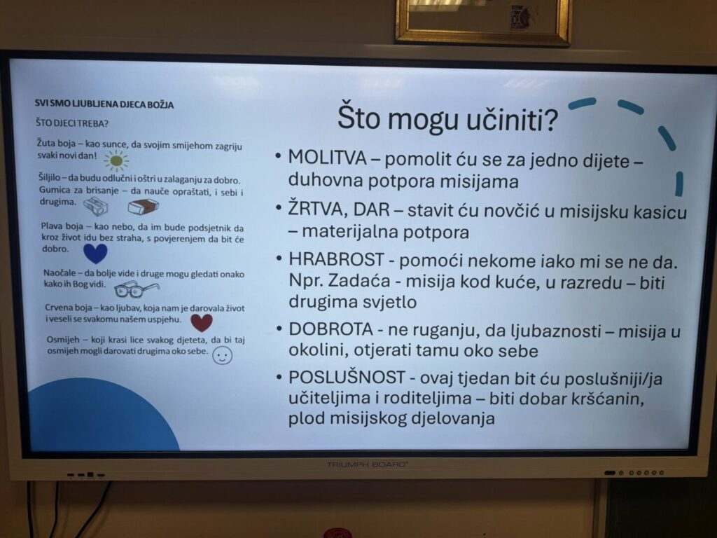 Djelo svetog djetinjstva najstarija organizacija je koja se brine o djeci i to na način da djeca pomažu djeci bila ona blizu ili daleko Učenici su kroz tjedan upoznali život misionara u Anatomiji gdje je bio i naš požeški misionar fra Tomica Hruška kao i priču iz života sestre Samuele o maloj Catalini iz Argentine. U završnom danu u petak učenici su pokušali prepoznati sebe što žele biti drugima, stvoriti zvukove šuškanja i ritma od kuhinjskih i svakodnevnih pomagala kako bi glazbom druge razveselili i osmišljavali odjeću i pokrivače koji bi zaštitili djecu. Ovom radionicom učenici su učili razmišljati o drugima oko sebe koji ih trebaju.