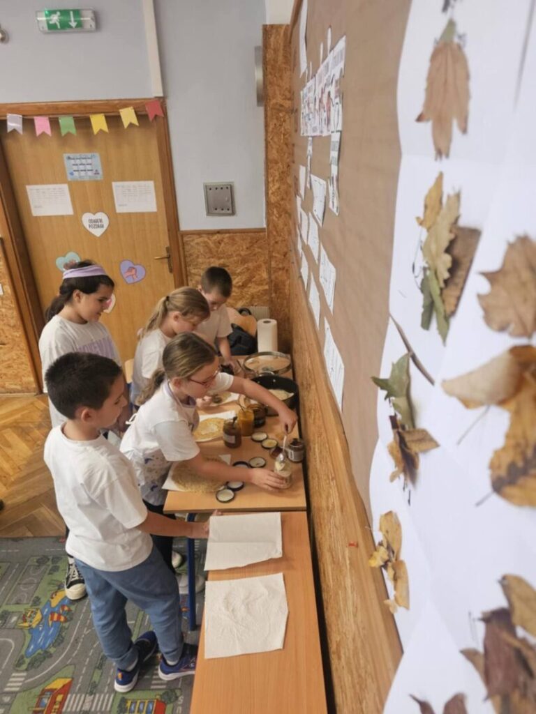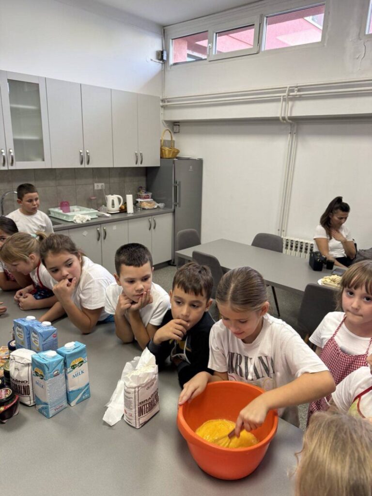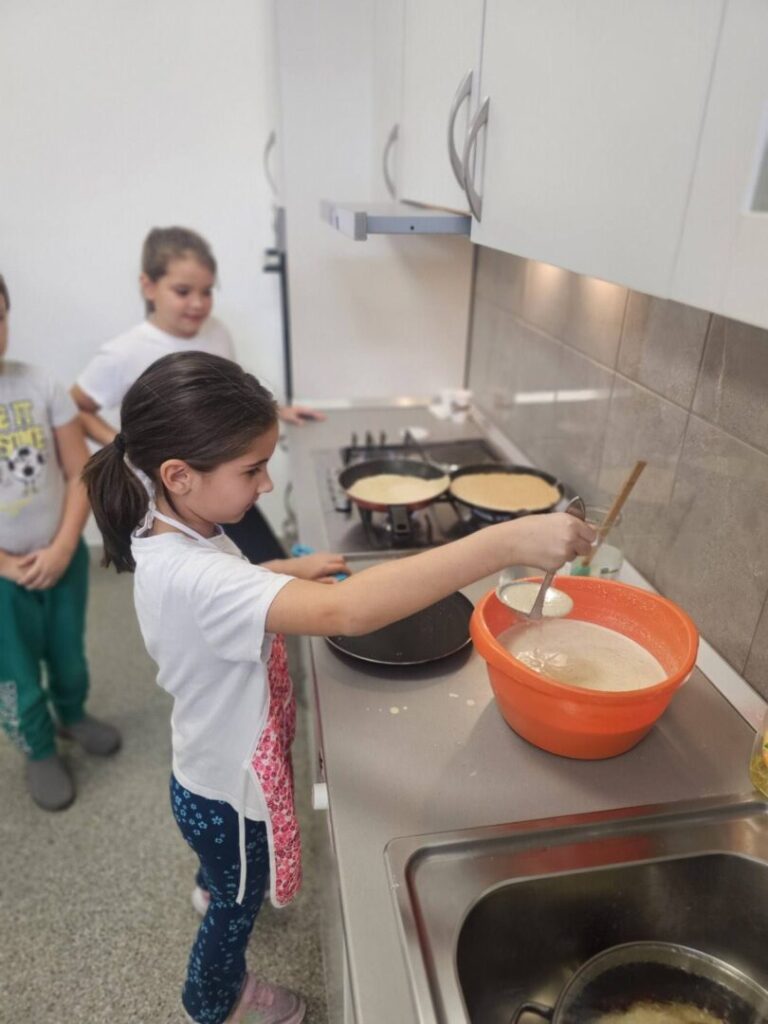 Danas su ucenici 2.b razreda ususret obilježavanju Dana kruha pekli zdrave palačinke u školskoj kuhinji. Učenici su samostalno razbijali domaca jaja, mijesali, dodavali integralno brasno, mlijeko bez laktoze, mineralnu vodu, vanilin šećer i limun šećer.Svaki učenik je na malo kokosova ulja ispekao svoju palačinku.Nakon toga su objedovali uz domace pekmeze i zdravu varijantu nutele.Bili su sretni, ponosni i siti.